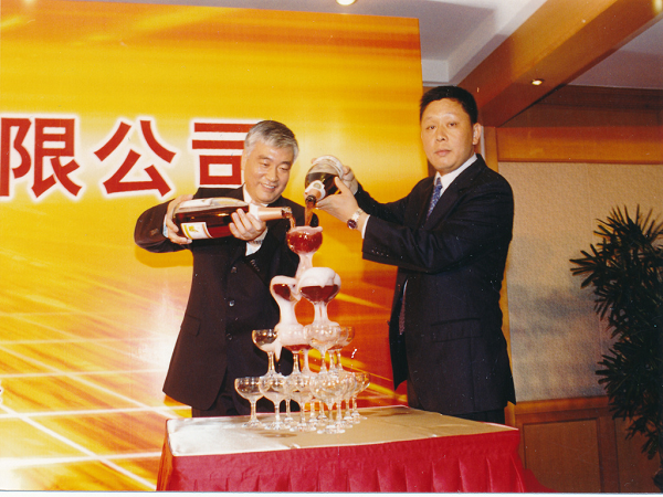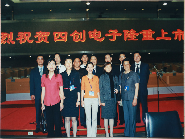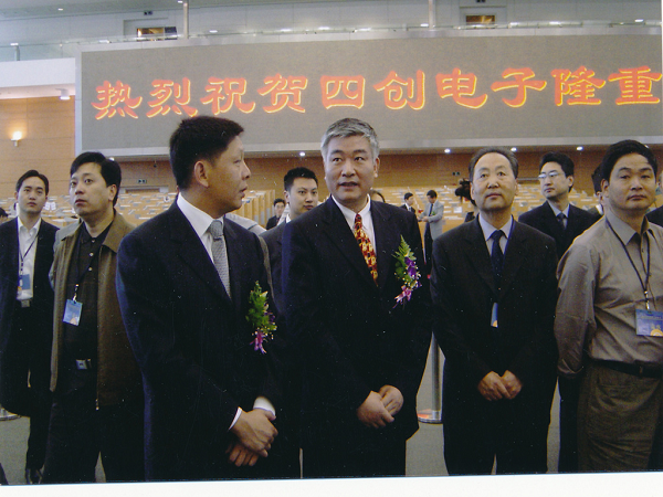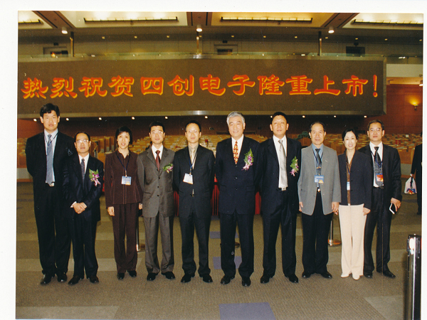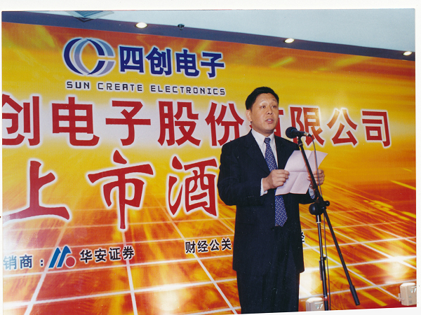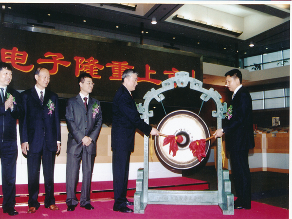 2004年5月9日晚,于上海紫金山大酒店舉行上市酒會(huì),時(shí)任中國電子科技集團(tuán)公司總經(jīng)理王志剛與時(shí)任公司董事長吳曼青共筑香檳塔