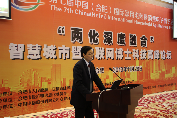 11月28日,由安徽省人民政府、工業(yè)和信息化部、中國國際貿(mào)易促進(jìn)委員會(huì)主辦,安徽省經(jīng)信委、合肥市人民政府、安徽省信息化協(xié)會(huì)承辦的《兩化深度融合之智慧城市暨物聯(lián)網(wǎng)博士科技高峰論壇》在合肥市稻香樓賓館隆重舉行。我公司連同中國電信安徽分公司、中國移動(dòng)安徽有限公司、中國聯(lián)通安徽分公司作為協(xié)辦單位參加了本次論壇。公司副總經(jīng)理王佐成代表公司出席會(huì)議并做了演講。