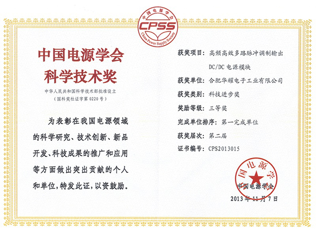 近日,公司下屬子公司華耀電子“高頻高效多路脈沖調(diào)制輸出DC/DC電源模塊”項(xiàng)目榮獲第二屆中國電源學(xué)會(huì)科技進(jìn)步獎(jiǎng)技術(shù)開發(fā)類三等獎(jiǎng)。