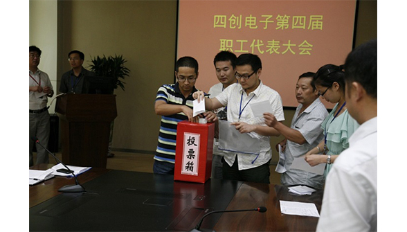 在總監(jiān)票人和監(jiān)票人的監(jiān)督下,到會(huì)的64名正式代表以無記名投票的方式,選舉出王曉龍等9人為四創(chuàng)電子第四屆分工會(huì)委員。